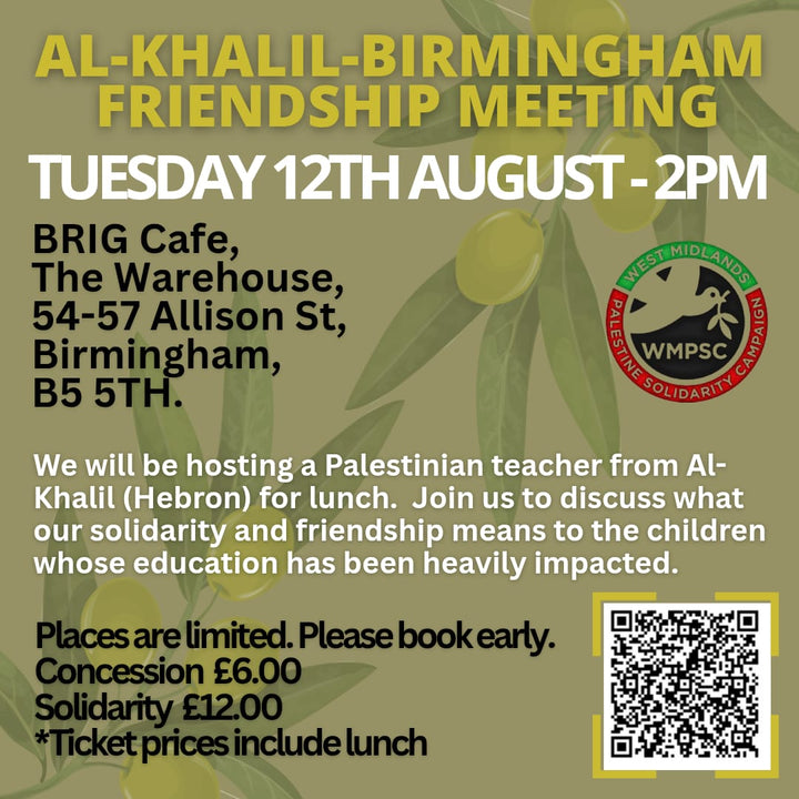 We will be hosting a Palestinian from Al-Khalil(Hebron) for lunch on Tuesday the 12th August 2025 2pm at the BRIGS cafe, The Warehouse, 54-57 Allison St, Birmingham B5 5TH.
