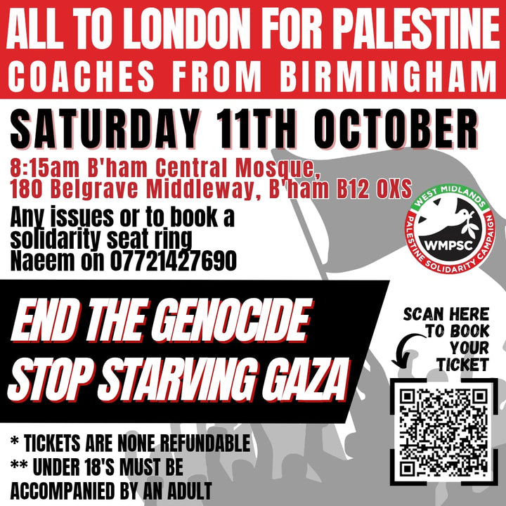 Coaches will be travelling from the Central Mosque leaving at 8:15 am on Saturday 11th October 2025 and leaving London at 4:00 pm (location to be confirmed) to return to Birmingham for approximately 8:30pm - Please note tickets are non-refundable